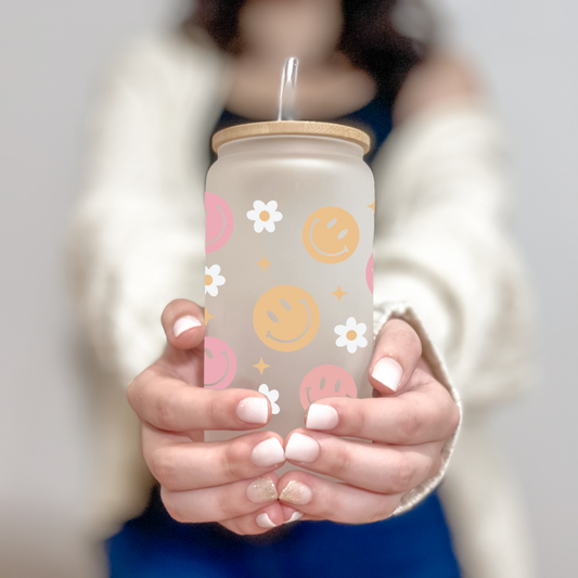 16oz Retro Smiley Glass Cup with Bamboo Lid