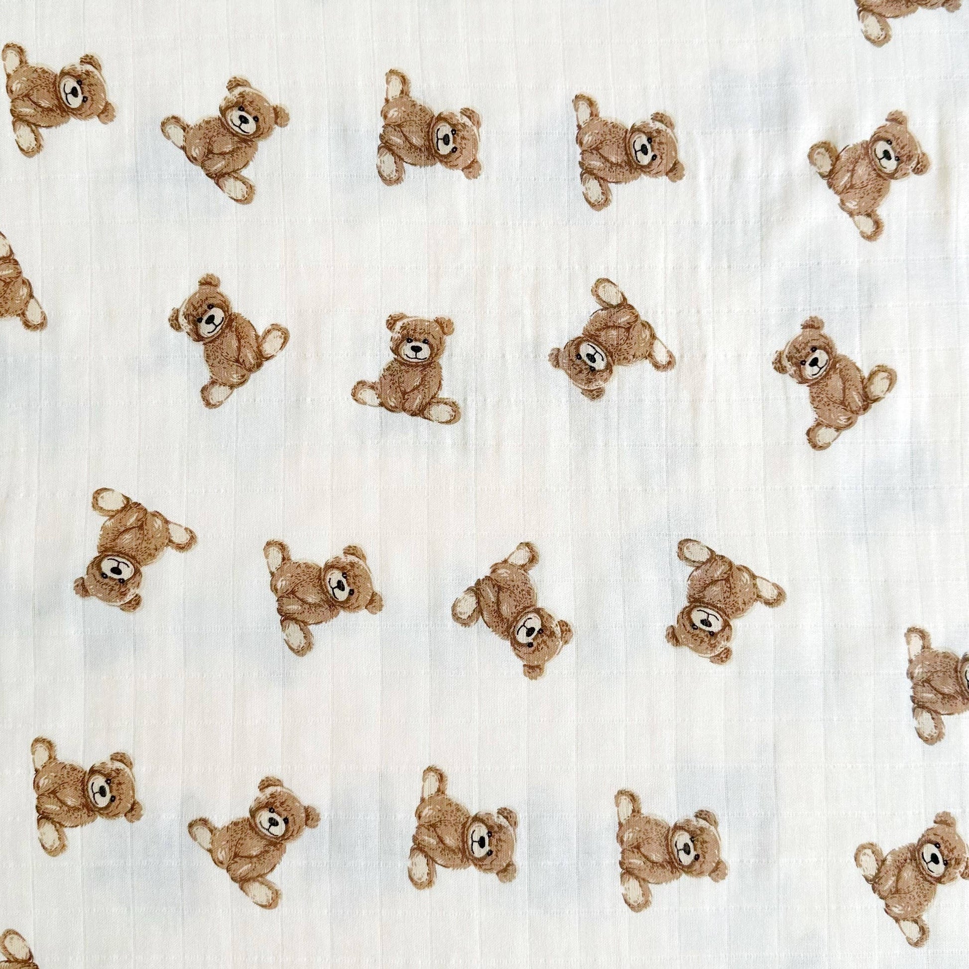 Our pre-washed muslin swaddle blanket with a Teddy Bear print is a must-have for all new parents. Crafted with two layers of ultra-soft and breathable bamboo fiber and organic cotton, this blanket is gentle on your baby’s delicate skin. Its large size (47"x47") gives it multiple uses, such as a nursing cover, stroller cover, or swaddle. This muslin swaddle blanket is the perfect baby shower gift or presents for any little one. Get yours today and add it to your inventory!