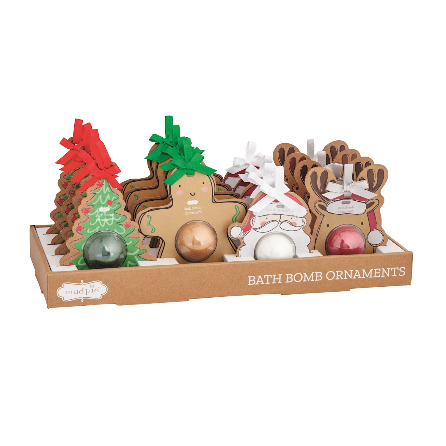 Scented bath bomb comes in kraft figural display card ornament with grosgrain ribbon hanger