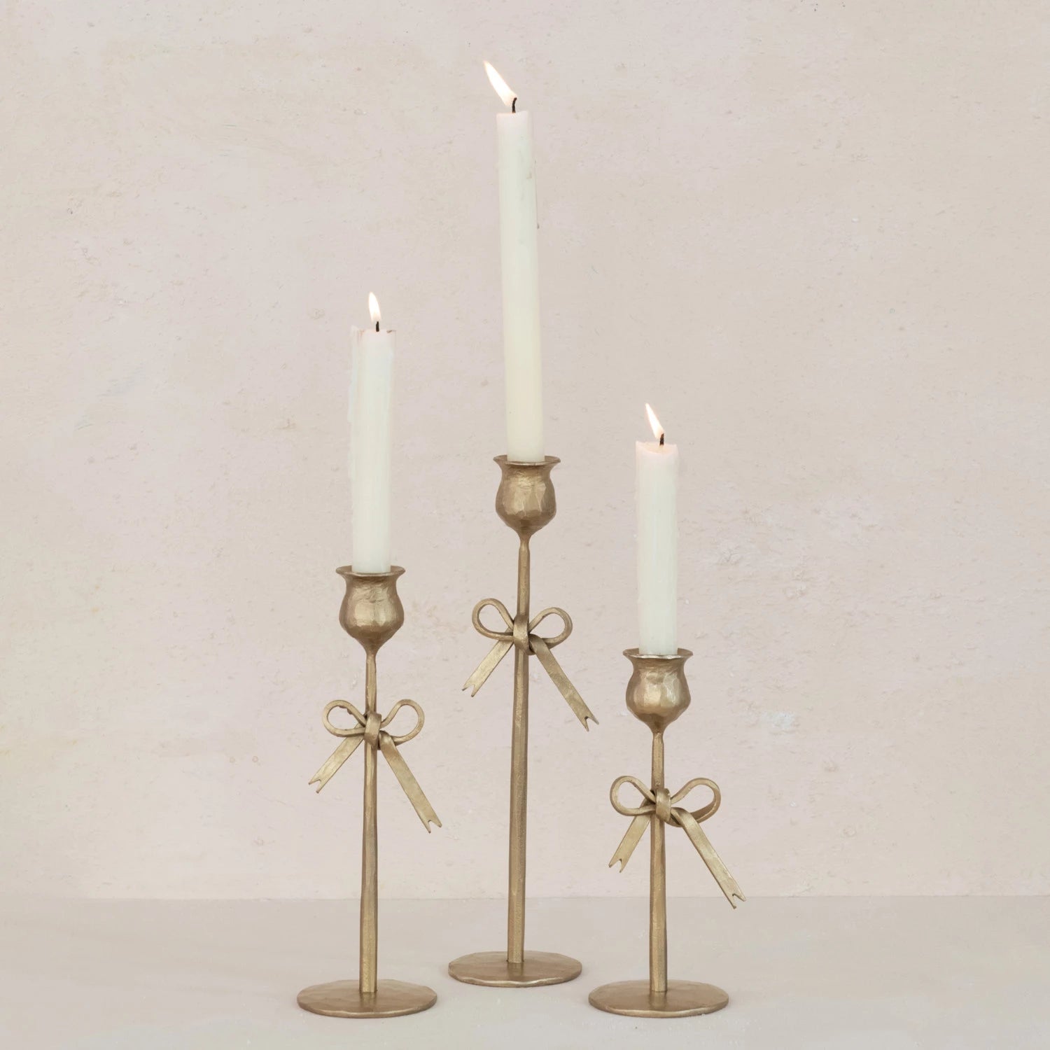 - 3" Round x 12"H, 3" Round x 9-1/2"H & 3" Round x 8"H Hand-Forged Iron Taper Holders w/ Bow, Antique Gold Finish