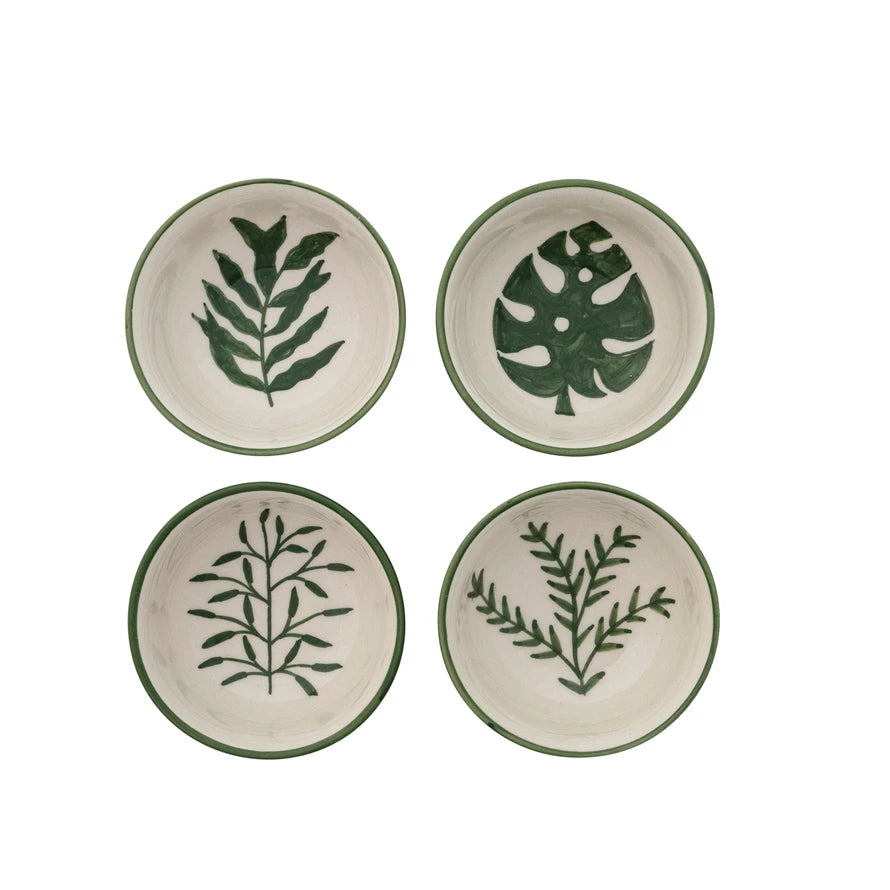 4" Round x 1-3/4"H Hand-Painted Stoneware Bowl w/ Pattern & Botanical Inside, Cream Color & Dark Green