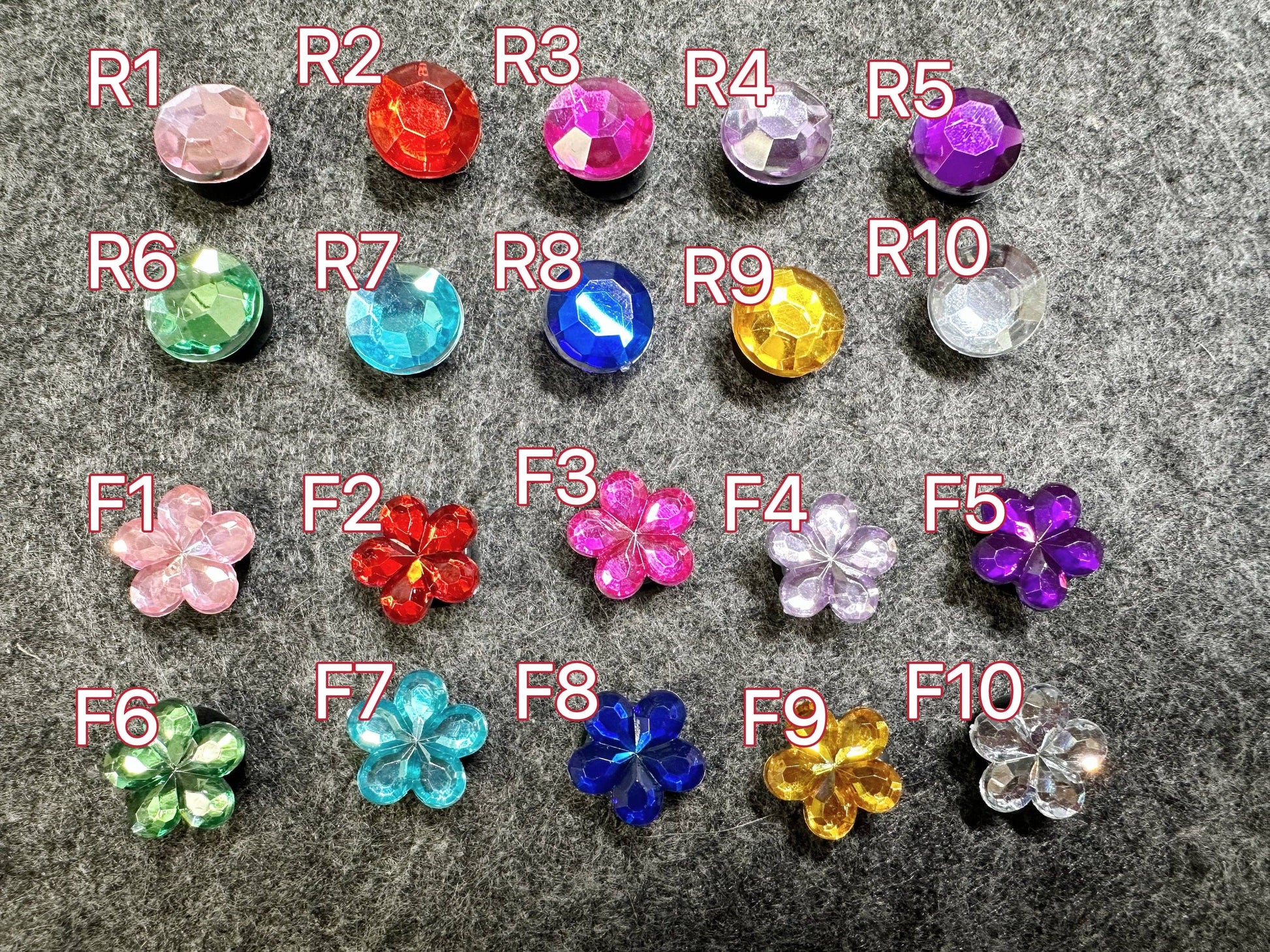 Colorful Gems: #F1 light pink, #F5 dark purple, #F6 green