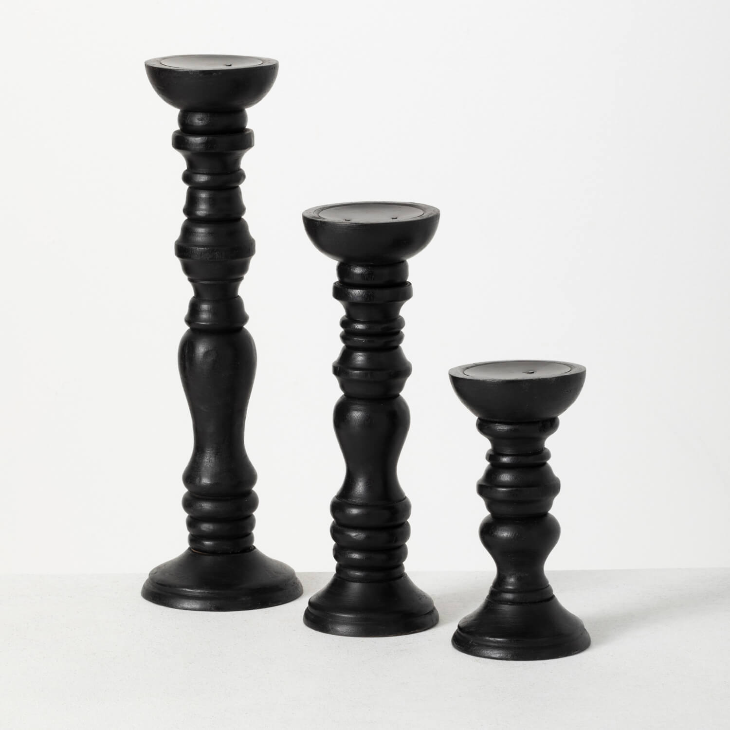Nothing tops a mantle like the traditional candlestick, and this trio is no exception. Painted deep black, these curvaceous mango wood holders hold 4" candles and measure in at 8", 12" and 16" in height.