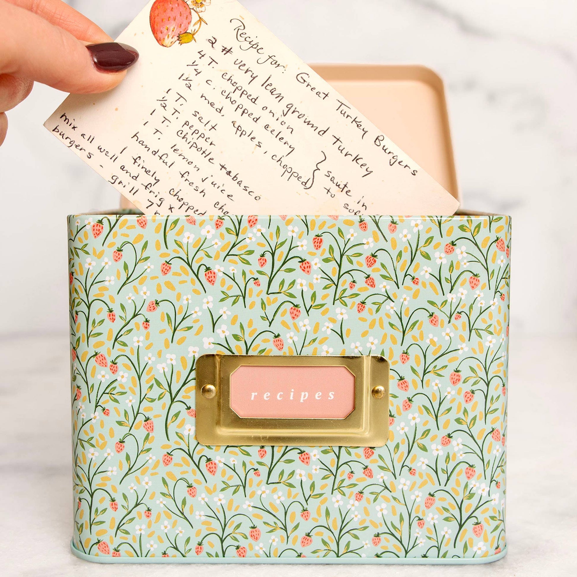 Organize cherished recipes in the sweet Strawberry Meadow Tin Recipe Box. With its charming berry and floral design, this metal storage box makes a thoughtful gift for mom on Mother's Day, home cooks, newlyweds, or anyone who loves to preserve family traditions in style.