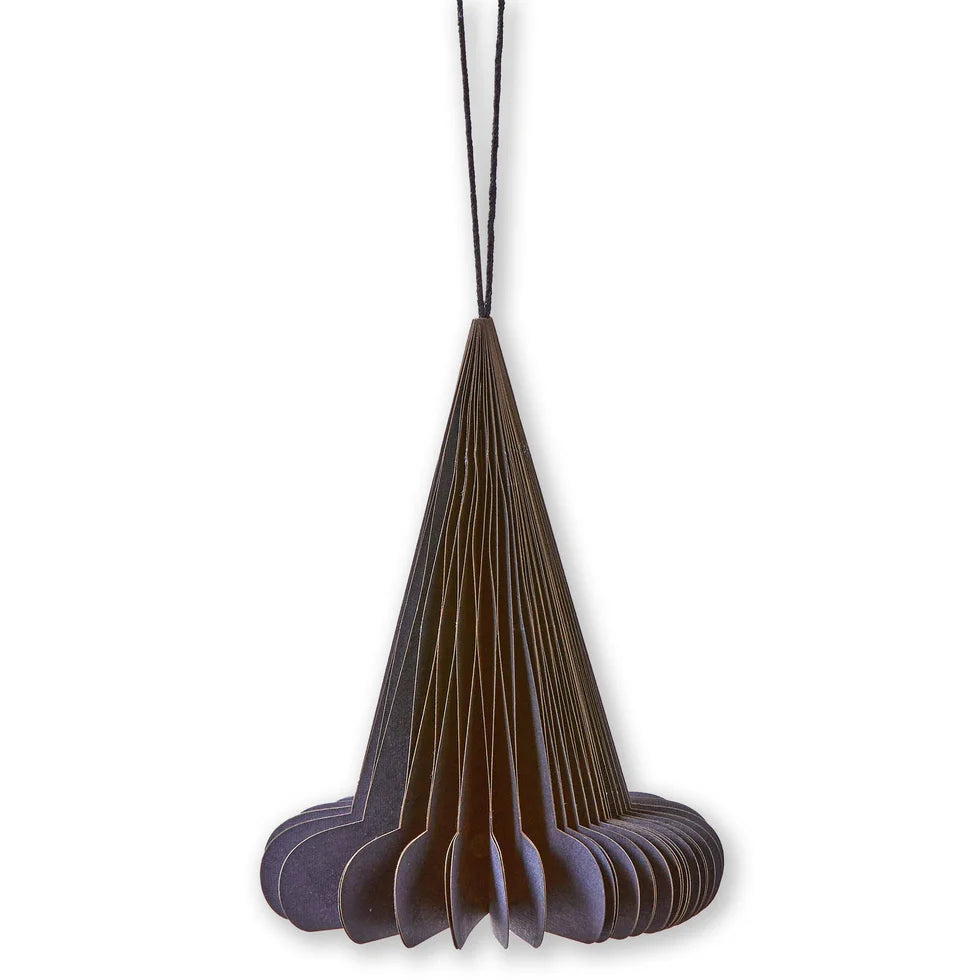Create a spooky atmosphere with these witch hat paper decorations. Made from handmade paper and featuring a magnetic closure, this witch hat can be easily hung from ceilings to add a touch of Halloween magic.